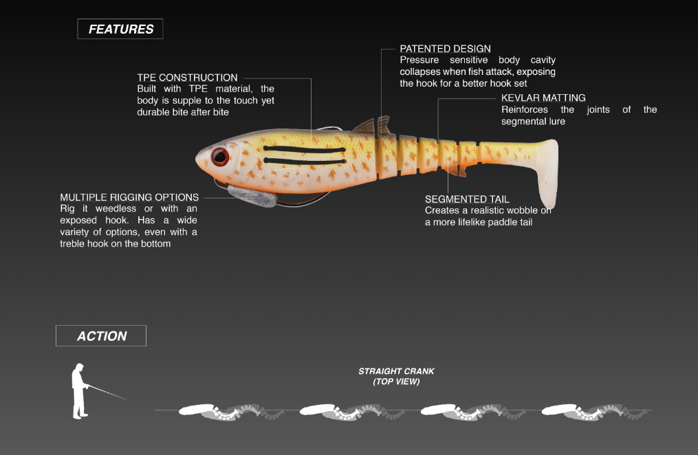 The all new Zerek Flat Shad-X is the updated version of the already successful Flat Shad Pro. Retaining the super soft hollow cavity body for improved hook ups when rigged weedless, it features a new segmented tail, similar to that of the Live Mullet, held together by a tough kevlar matting, albeit with a paddle tail. Constructed with the eco-friendly tear resistant TPE material, the Zerek Flat Shad-X has a realistically life-like action as the tail wobbles from side to side. Work it fast with lifts and drops or simply a straight retrieve, rig it weedless or with its hooks exposed, the Flat Shad-X is the most versatile and life-like soft plastic yet!
