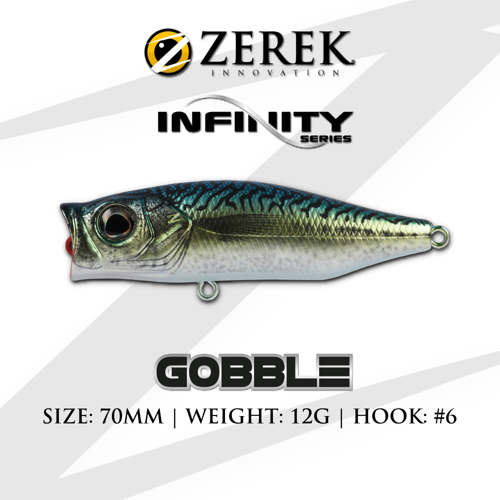 The Gobble is Zerek’s newest light tackle popper. Designed with an absolutely proportionate body, the Gobble can create the biggest chug splash, worked lightly for a softer approach, or simply a side to side walk the dog motion. Internally, tiny ball bearings create high pitch rattles to attract further attention on the surface on each movement. Its 70mm profile is ideal for most situations in both fresh and saltwater. And finally, it features a lifelike spray paint, with a realistic tint finishing that makes the lure look just like a real bait fish!